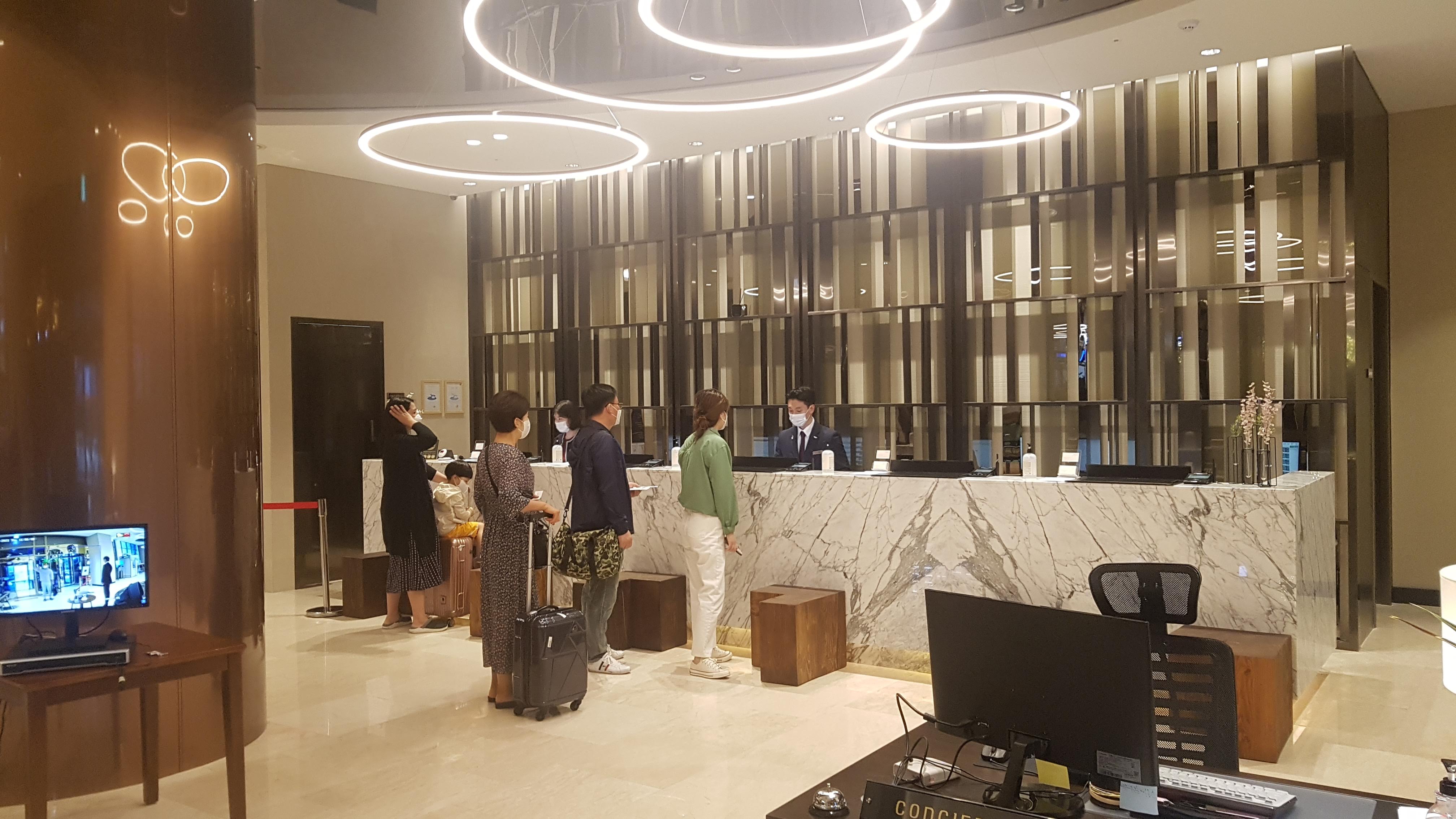 "라마다 프라자 돌산 여수"의 외관과 로비입니다. 외관이 참 예쁩니다. 주차공간은 지상에 있는 게 특징입니다. 2층에서 4층까지가 주차장이고요. 지하 1층도 주차장이에요. 로비는 1층에 있습니다. 직원이 친절한 느낌은 없어요.ㅎㅎ. 간단하게 체크인했습니다.
