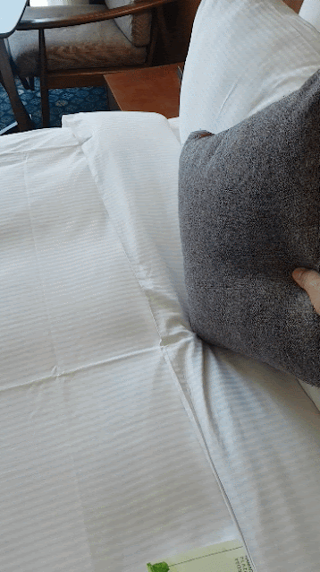 침대의 상태입니다. 에코 세이브를 위한 안내서가 있지만, 청소 서비스는 꼭 받을 것입니다. ㅎㅎ. 그리고 쿠션도 있어요. 베드 상태는 괜찮았어요. 베게도 폭신폭신합니다. 제가 베게를 눌러봤어요. ㅎㅎ 잠자리는 불편함이 없었습니다.