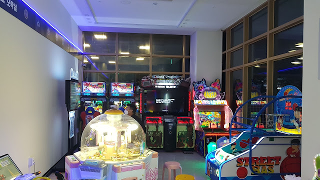 로비가 있는 1층에는 편의점(GS25), 카페, 게임장이 있어요. 호텔 안에서만 재밌게 지낼 수 있게 만들어놨어요.