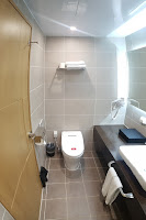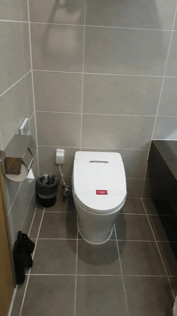 그리고 화장실입니다. 화장실은 쾌적한 넓이와 공간이에요. 먼저 변기는 비데가 장착되어 있어요. 그리고 위에 타월들이 비치되어 있습니다.