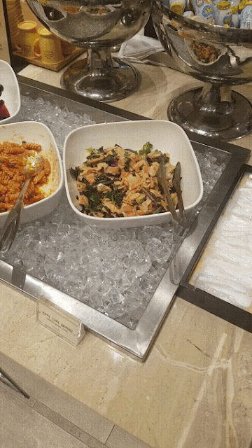 메인 요리를 좀 집어왔어요. ㅋㅋ. 연어구이 맛있고, 부침개도 맛있고, 크림 새우는 미니사이즈, 볶음밥은 별로였던 기억이 나네요.