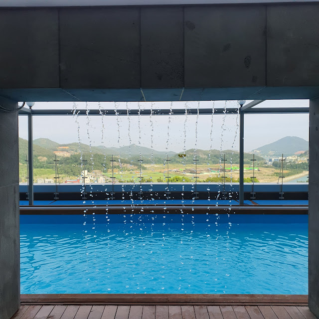 "라테르니 파크 풀"의 전체적인 모습입니다. 수영장의 크기가 "라테르니 인피니티 풀"보다 큽니다. 그리고 유아를 위한 수영 공간이 있어서 좋았어요. 비치 베드들도 더 많이 있습니다. 뷰는 아쉽지만 여수의 포레스프 뷰에요.