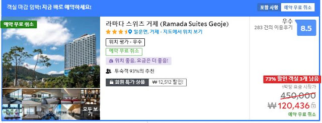 안녕하세요 이번 여름 휴가는 거제도로 다녀왔는데요. 남해가 참 깨끗하고 이쁘더라고요. 그러면서 바다 전망을 즐길 수 있는 숙소가 어디인가 며칠을 물색했는데요. 탁트인 전망은 여기 라마다 스위츠 거제가 정말 좋았습니당.~ 정말 최근에 생긴 숙소라서 컨디션이 최고였구요. 건물 전체가 동향이라 아침 햇살이 심하게 눈부신다는 점! 알아두시면 되겠습니당.~ 호텔은 아고다에서 저렴하게 예약했습니다. 예약 좌표