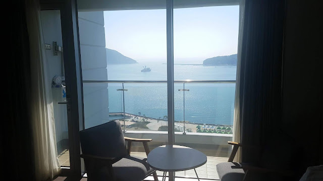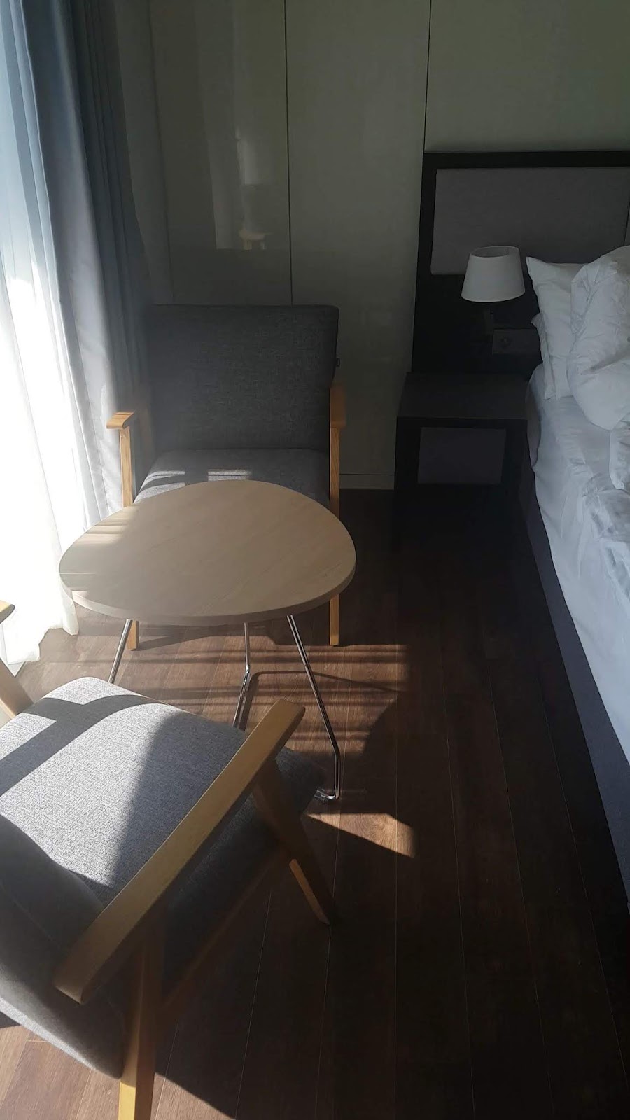 디럭스 패밀리룸은 이렇게 소파체어 2개랑 티테이블이 마련되어 있습니당.~ 4인이 이용해서, 화장대 의자 침대 다 끌어다 썼네요. 뷰가 또 보이죠. 아침에 햇살이 굉장히 강렬합니당.~ 커튼 칠 수밖에 없어요.