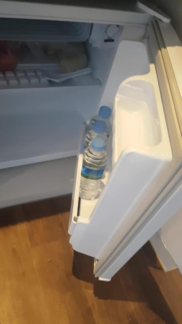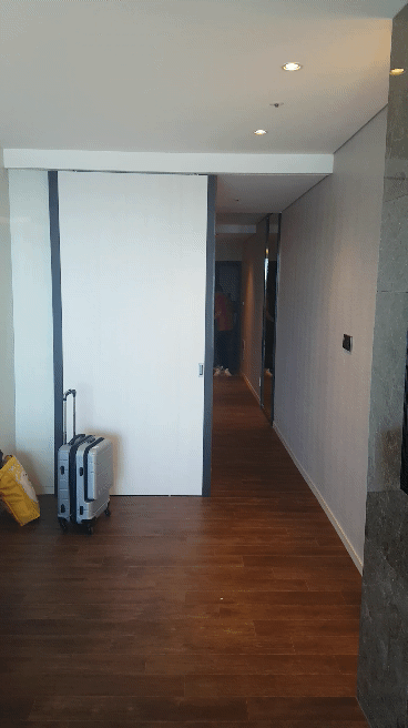 방 구조가 길다란 구조라 복도 아닌 복도가 있습니당.~ 복도에 화장실 입구와 미니바가 있어요.