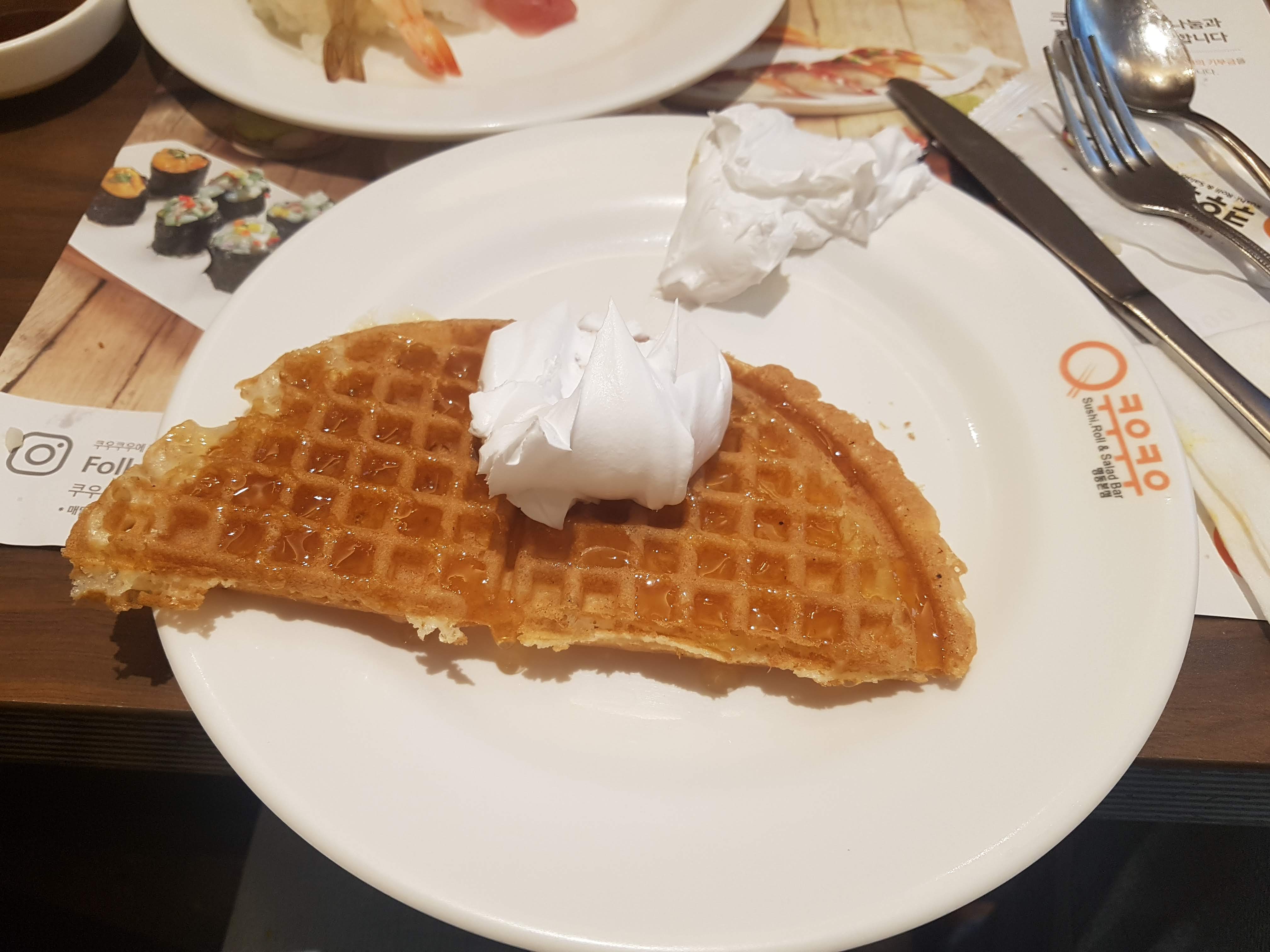 쿠우쿠우 가는 이유 다들 이거이시지요? 와플대학 저리가게 하는, 갓구운 셀프 와플, 저는 이날 베이직하게 크림에 사과잼을 발라서 먹었어요. 초등학교 앞 문방구 맛. 최고!
