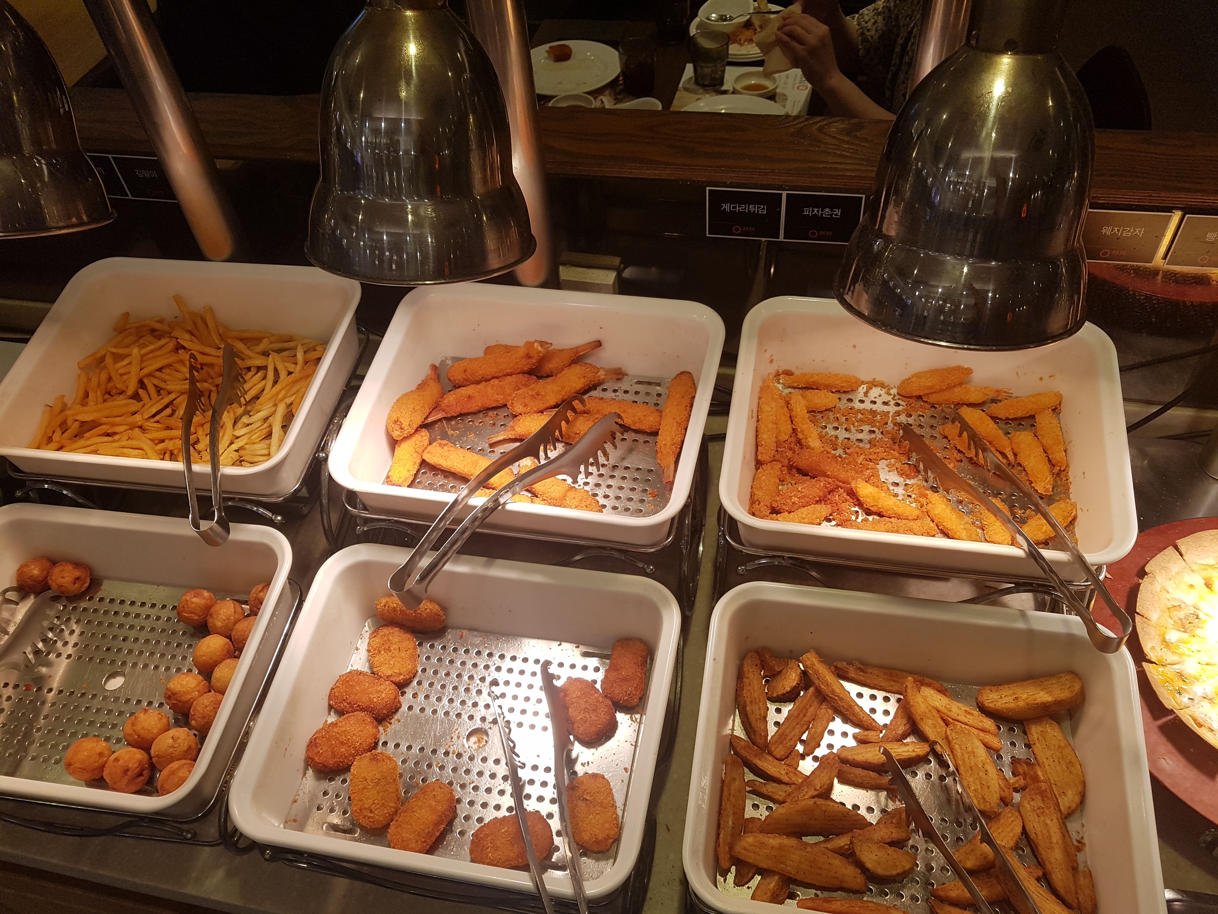 제가 쿠우쿠우 온 이유. 쿠우쿠우 튀김 요리가 참 맛나요. 프렌치 프라이, 게다리 튀김, 새우 튀김, 타코야키, 고로케, 웨지 감자입니다.